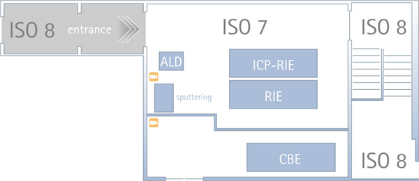 La camera bianca del NEST è disposta su due diversi piani e ha due zone pricipali a classificazione ISO 7 e ISO 6 (si veda mappa sottostante) collegate da una scala di servizio di classe ISO 8.